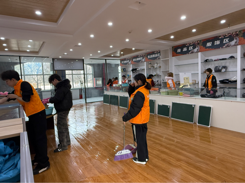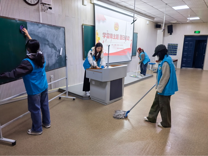 活动紧扣立德树人根本任务,构建思想引领、交流互鉴、实践育人三维体系。在思想引领方面,各团支部通过宣讲、观看专题纪录片等形式,系统解读雷锋同志先进事迹,深入阐释雷锋精神核心内涵,引导团员精准把握新时代实践要求。在交流互鉴方面,“我心中的雷锋精神”分享会如期举行,团员们结合学业与成长经历畅谈感悟,纷纷表示要将钉钉子精神融入日常,主动帮扶同学、服务集体,让雷锋精神见于点滴。在实践育人方面,团总支组织团员开展精准化志愿服务:分组对学校杂货铺进行全方位清洁,整理货架、清理死角;同步对教室进行深度清洁,擦拭门窗黑板、整理图书角。团员们在劳动中锤炼品格,深化服务意识。